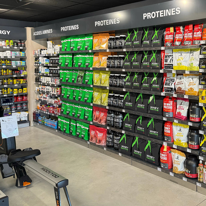 Whey isolate, proteines vegetales, créatine, BCAA, pre workouts, collagene, produits pour la recuperation et pour la santé.