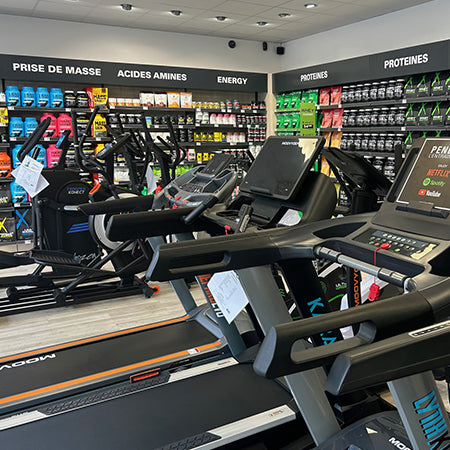 Venez essayer nos équipements : tapis de course, vélos d’appartement, rameurs, bancs de musculation, cages et vélos elliptiques.