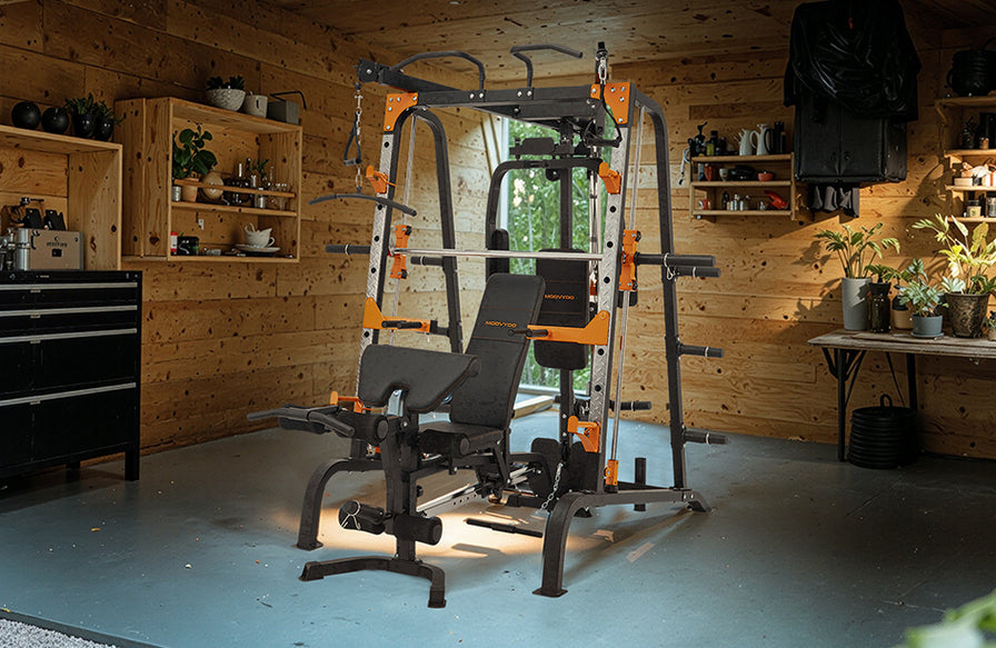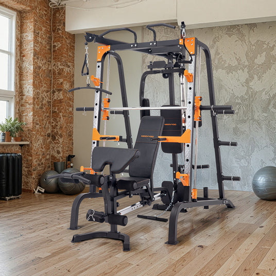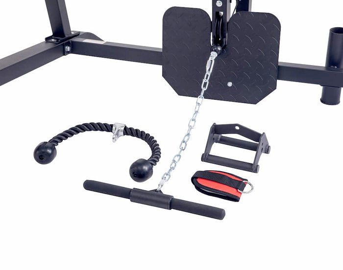 Sa nouvelle version vous offre un système de barre guidée à roulements à billes pour plus de fluidité et robustesse. Retrouvez également un pull-up bar et un dip handle pour une machine encore plus complète !
